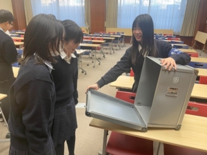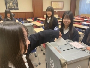 理解した上で模擬投票を行いました。また、模擬投票は、各クラスから選ばれた係生徒が準備、投票所の運営、投票結果の集計を行いました。投票会場では、実際に使用される投票箱を使用し、係生徒が投票管理人・投票立会人の腕章をつけて訪れた生徒を迎えていました。生徒たちは、政策を調べ、実際に票を投じてことなどを通して、選挙に主体的に関わることの重要性を実感することができたようです。