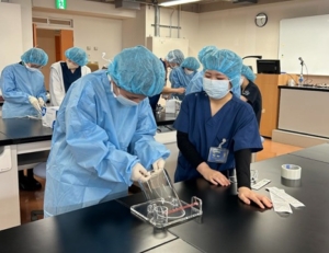 o 獣医師体験:大学の先生による指導のもと、本物の器具を用いた外科糸結びや犬の血液塗抹標本の作成・観察を体験しました。
