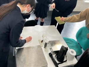 o 研究室見学: 田所誠研究室にて、学生の皆さんからレクチャーを受けながら液体窒素や炭を使った実験などを見学しました。